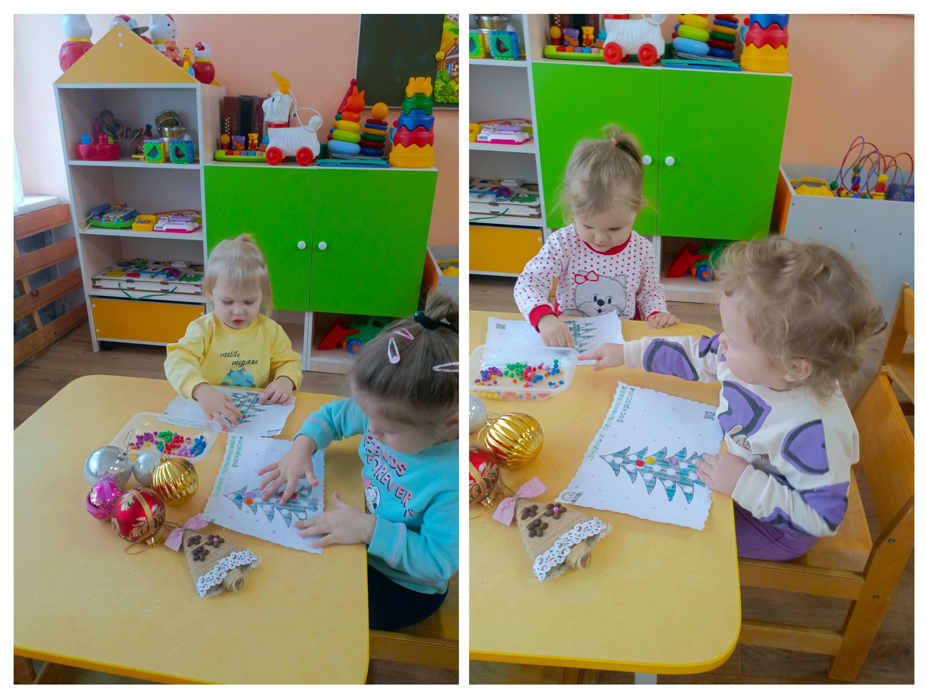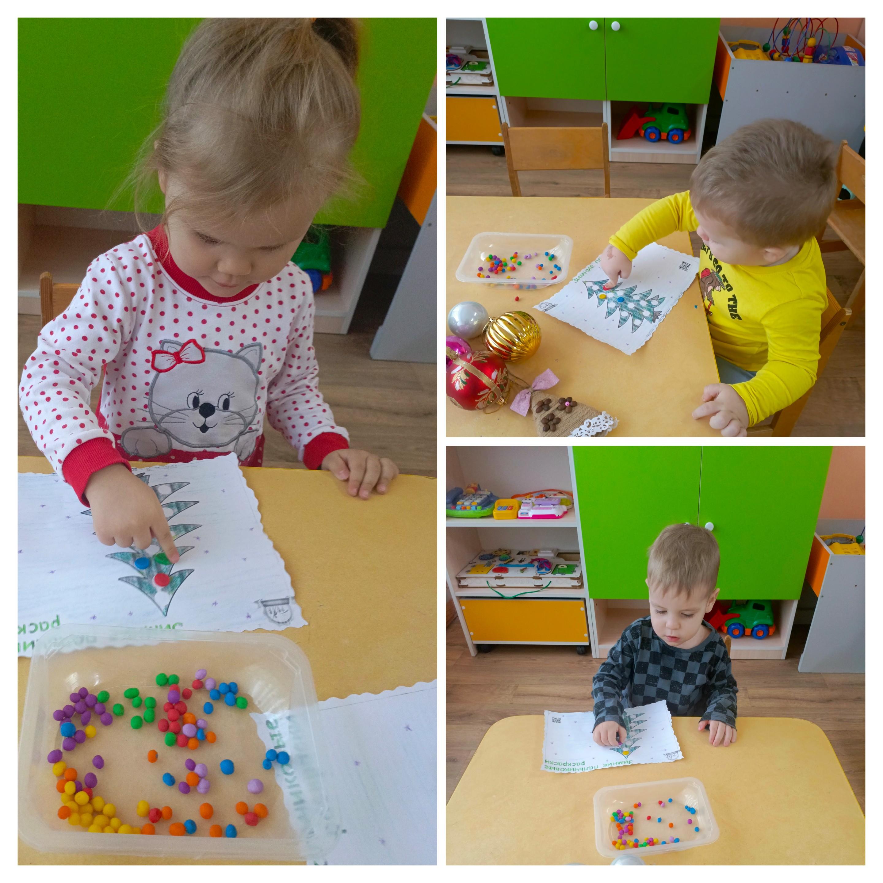 Главным символом Нового года, конечно же является елка, украшенная разноцветными игрушками, гирляндами, шарами. Наши ребятки тоже решили нарядить елочку. Они "повесили" на нее разноцветные пластилиновые шары.